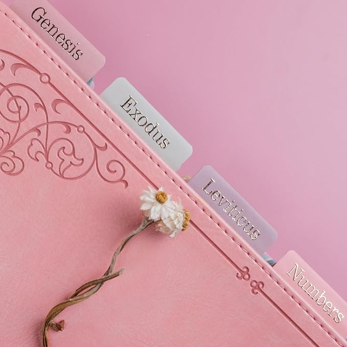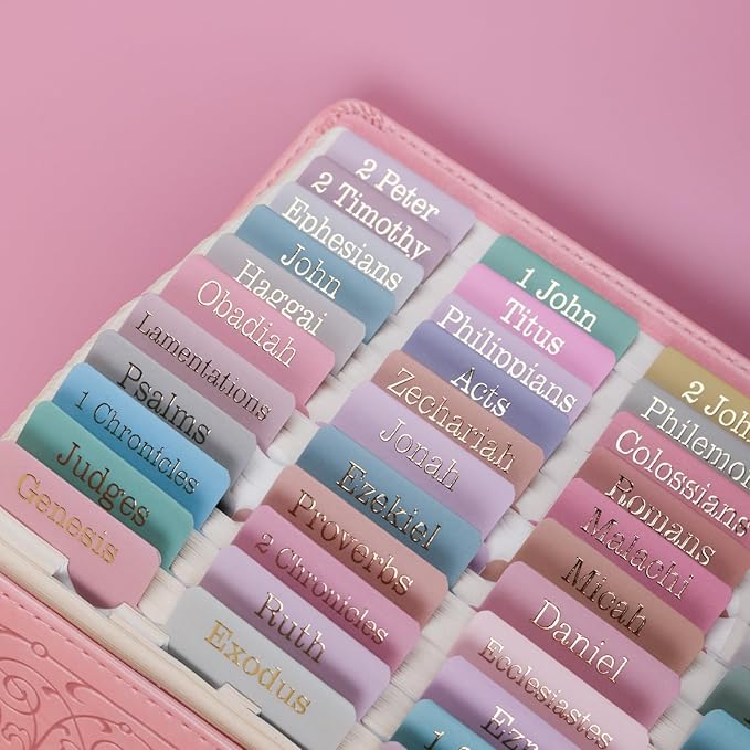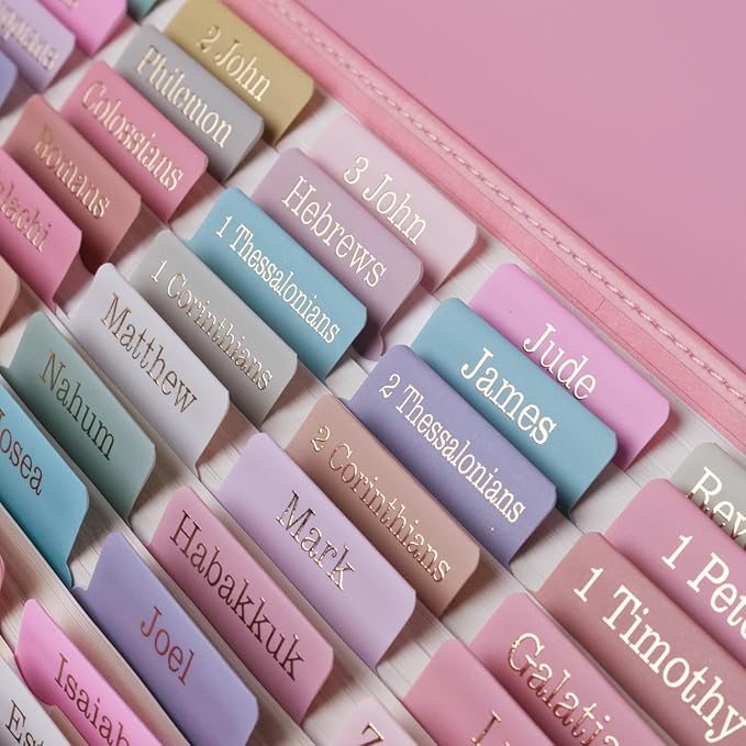 - Large Print, Easy to Read & Easy to Install: Silky velvet touch laminate,carefully designed pretty Bible accessories . The peel-and-stick Bible index tabs are self adhesive, simply align them with the provided guide or place them creatively.