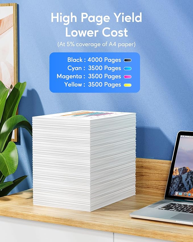 - 📃High Page Yield: Up to 4,000 Pages per Black cartridge, 3,500 Pages per Cyan/Yellow/Magenta Cartridge(5% coverage at A4 paper)