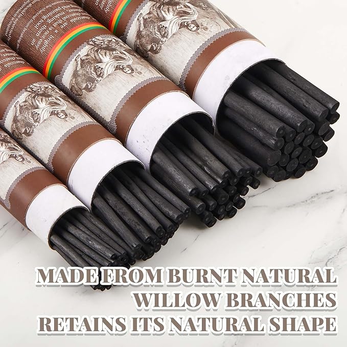 - Sturdy and Reliable Willow Charcoal: we have updated the paper tube packaging box and still provide the smooth and quality willow carbon bar; You can experience the blend of endurance and convenience, ensuring lasting usage, it slides smoothly and has smooth lines when applied; Willow is darker and more forgiving than vine, which can produce a range of tones, and willow breaks less than vine charcoal