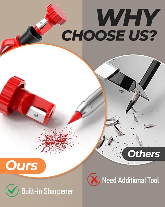 - Professional Marker Pencil With Sharpener: The Long nib construction pencils adopts elongated metal tip design, It is 45mm long and 5.6 mm in diameter, which is more convenient to mark in any hole. In addition this, the woodworking pencils come with a built in sharpener screwed into the top of each work pencil for providing nice precision at all times