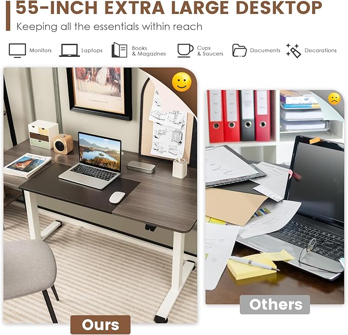 - Spacious Desktop & Complete Accessories: Our stand up desk comes with a spacious 55" x 28" desktop that provides ample space for 2 monitors or laptops. In addition, the standing computer desk comes with a cable hole and a cable bracket to keep your office area neat and tidy. And extra hook on the side of the desk makes it easy for you to place your bag and headphones.