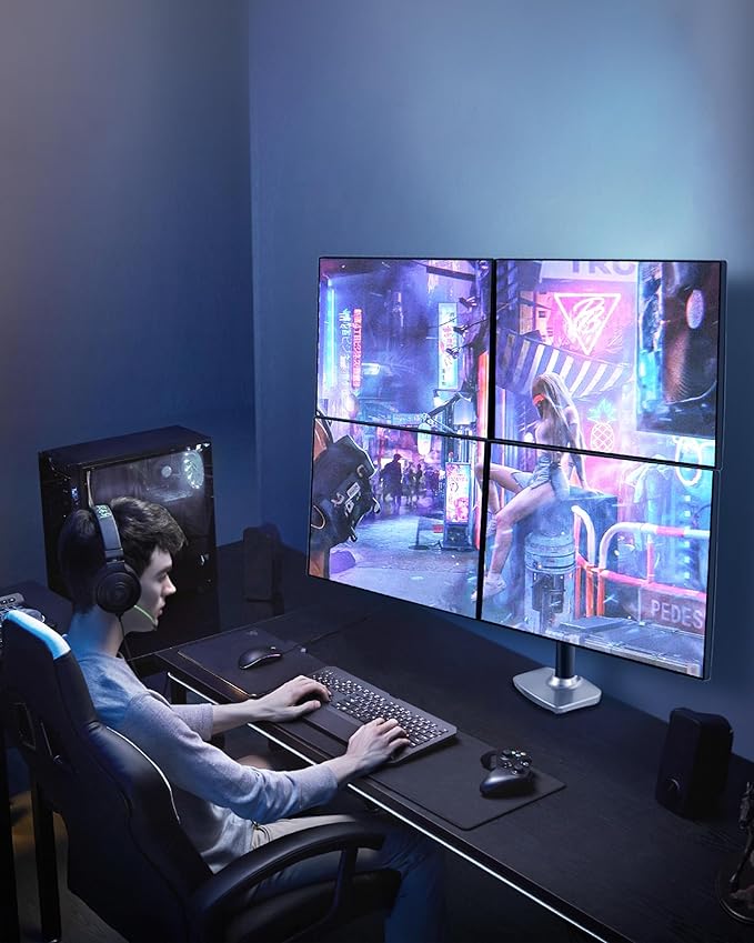 Quad Monitor Mount, Holds Screens up to 40 Inches and 25 lbs, Fully Adjustable 4 Monitor Mount with C-Clamp and Grommet Base, Aluminum, Silver
