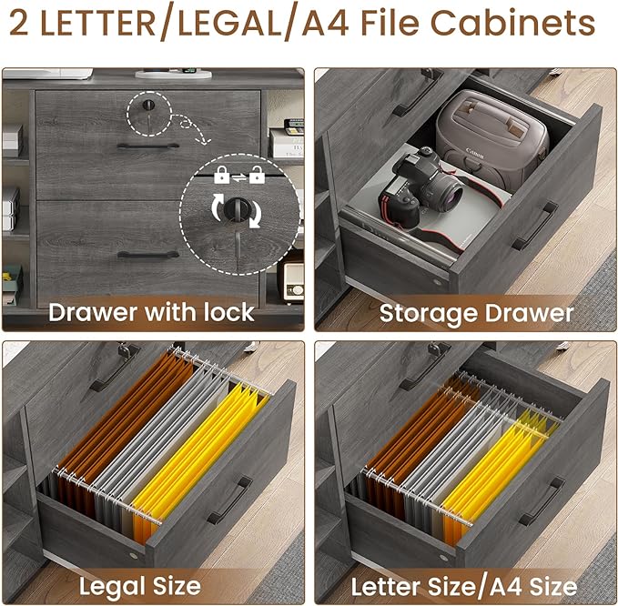 - πγWhat can you get?γ The file cabinet has 2 file drawers with 1 lock for Legal, Letter, A4 sizes standard file, power strip for charging 4 devices at the same time, spacious desktop large enough for printers and scanners, 6 storage shelves, 4 hooks and 4 industrial casters. Filing cabinet that can be combined with any computer desk to form an L-shaped office area.