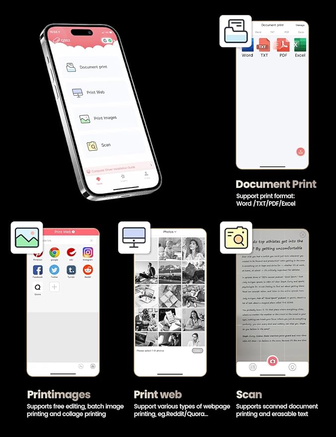 - Phomemo Q302 Mobile Printer - 【Powerful APP Upgrade】: Phomemo Q302 portable printer wireless travel with powerful [Phomemo] APP support, which allows you to print documents, web pages, photos and scans from your cell phone easily. The simple interface of the APP is easy to use and the functions are rich and varied, allowing you to accomplish various printing tasks anytime and anywhere. With this Phomemo app, you can manage your printing tasks more intelligently, improve work efficiency and enjoy a convenient printing experience