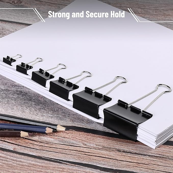 • Each binder clip is constructed with a durable black metal that offers a strong clasp for holding papers tightly, preventing slips or losses.