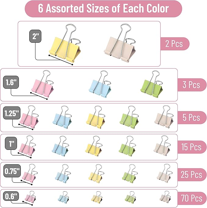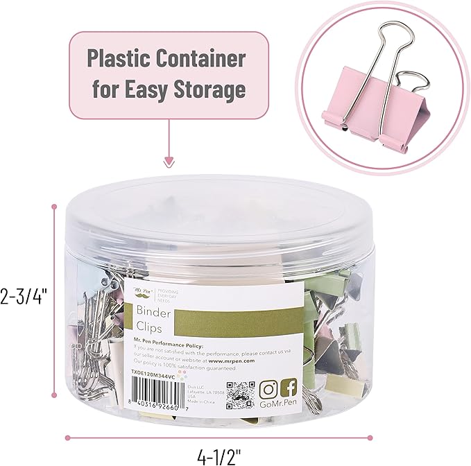 • Mr. Pen binder clips set is a colorful assortment of 120 clips, available in 6 sizes to suit a wide range of organizing needs, all neatly presented in a transparent, round container for easy selection.