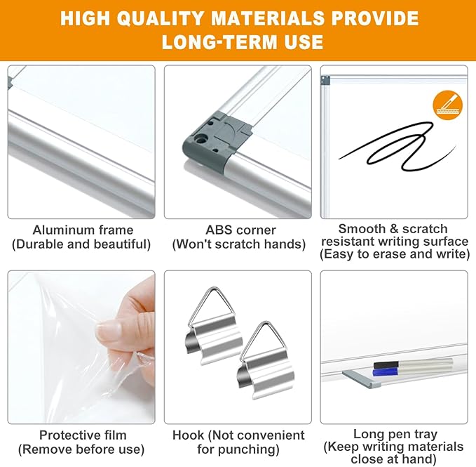 • The dry erase white board is made of high grade sturdy aluminum frame built with ABS plastic corners, no worry about pointy edges.
