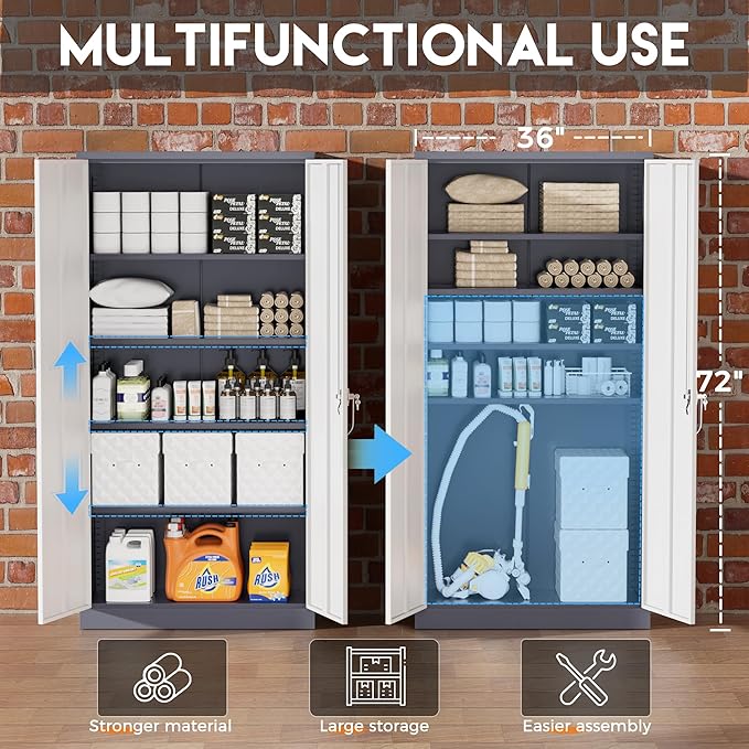 - 【Multipurpose Large Cabinet】Greenvelly 72"H x 36"W x 18"D lockable garage organization cabinet with 2 locking doors and 4 adjustable shelves, can move the shelves up or down according to your need, each layer can bear 150 pounds, suitable for storing office documents and tools, as well as heavy items. Durable black metal cabinets are an ideal choice for home office, utility room, laundry, kitchen, garage, school, shop, warehouse, business etc.