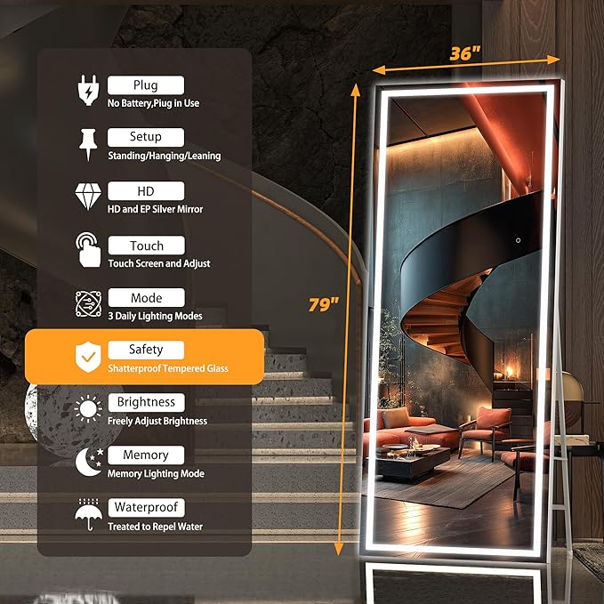 - 【Dimmable & 3 Color Temperature】This lighted full length mirror is multifunctional. You can press the button to change the color temperatures: Warm(3000K), natural (4000K) and white(6000K). You can also dim the brightness to your comfortable level. All these will be easily controlled by the touch button.