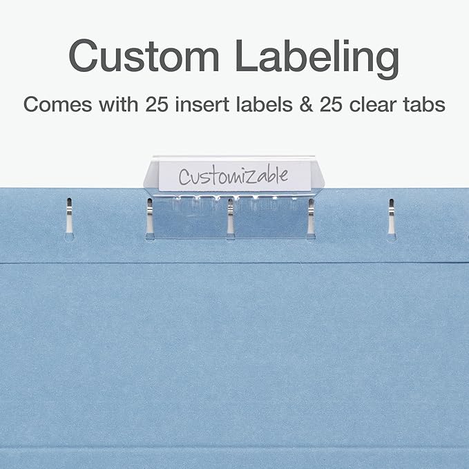 • 1/5 cut hanging file folders come with 25 white paper labels and clear plastic tabs so you can label your files and find things quickly