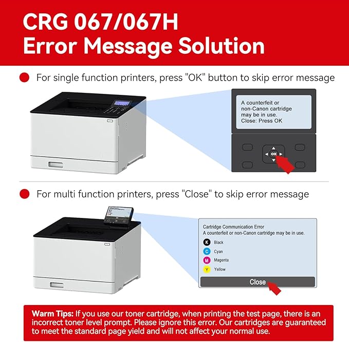- With Chip: 067H High Yield Toner Cartridges compatible replacement for Canon 067H 067 Toner Cartridge Set with built-in smart chips are engineered to ensure strong compatibility and accurate recognition