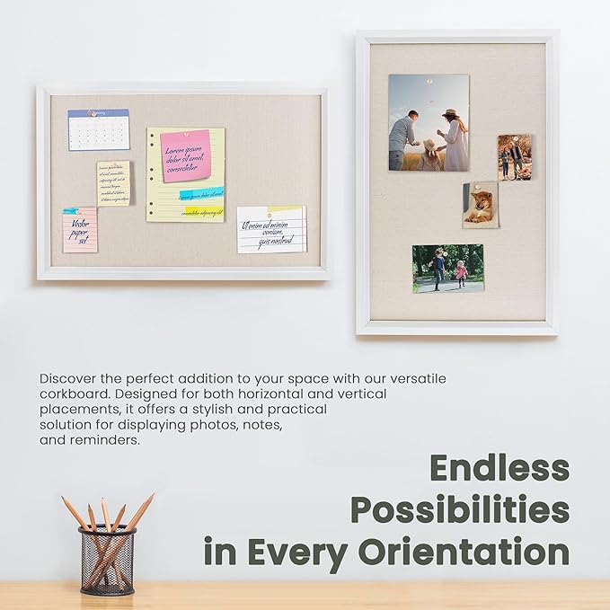 - Premium Solid Wood Frame: Cork board with a solid wood frame measuring 1.38" in width. This sturdy construction ensures durability and longevity, providing a reliable display solution for your photos, notes, and reminders. Its elegant design adds a touch of sophistication to any space, making it a versatile and stylish addition to your home or office decor.