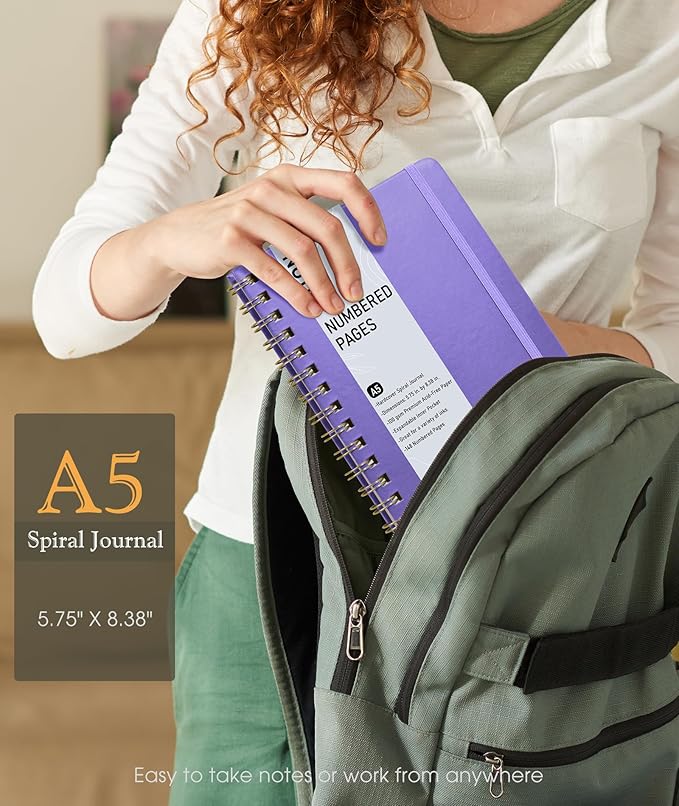 Lined Spiral Journal Notebook, A5 Hardcover Spiral Journals for Women Men, 150 Numbered Pages Spiral Bound Notebook, 100 GSM College Ruled Notebooks for Writing Note Taking 5.75" x 8.38", Purple