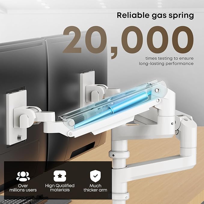 - Comfortable Ergonomic Design: This dual monitor arm desk mount raises monitors to eye level, improving posture, and relieving strain on the neck and shoulders while increasing your viewing experience and comfort, increasing space flexibly; And the cable management conceals the wires for a clutter-free appearance