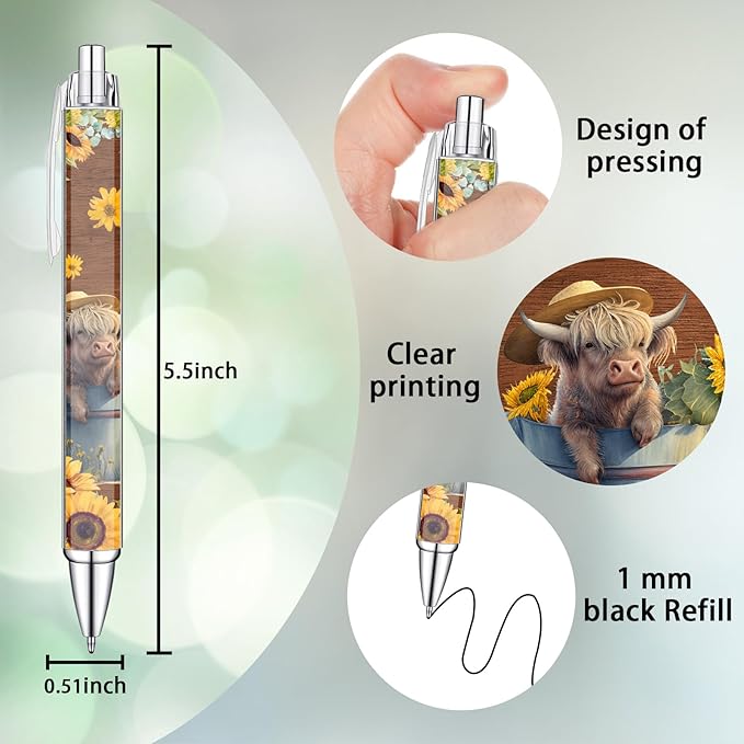 - Highland Cow and Sunflower Designs: Our Highland Cow Pens feature a delightful array of whimsical designs, each showcasing the iconic Highland cow and sunflowers. Adorned with charming illustrations, these pens infuse your writing experience with rustic elegance and artistic flair.