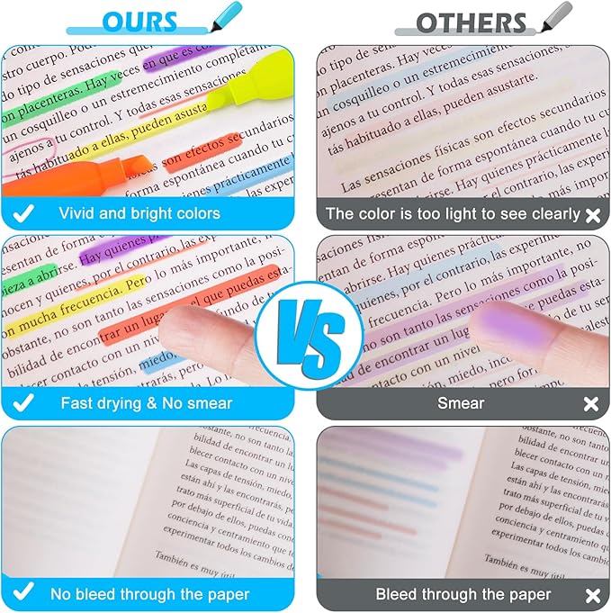 - Non-bleed & Quick-Drying: Highlighter markers use quick-drying ink, making highlighted marks clearly visible without worrying about the ink staining your hands and your book. Even if you highlight on one side of the page, the other side is still completely readable, and there's no need to worry about ink bleeding through and affecting the readability of the page.