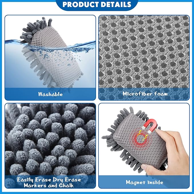 - Magnet Design: unlike other microfiber whiteboard erasers, the magnets are wrapped inside our dry erase erasers, which can be easily attached to the magnetic whiteboard without worrying about losing them. And the magnets are securely wrapped inside the dry erasers, so you don't have to worry about kids swallowing them