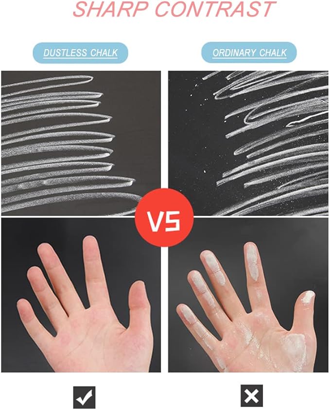 - 【MORE DURABLE】Dustless chalk is made from a high density of dustless chalk materials.One piece of clean chalk lasts about the same time as 10 pieces of regular chalk.