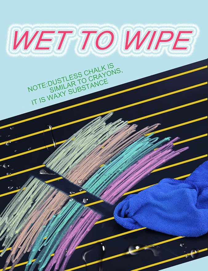 - 【WASHABLE CHALK】This no dust chalk needs to be wiped with a wet cloth or a wet eraser.Washable chalk is easy to clean, even if it gets on the clothes.