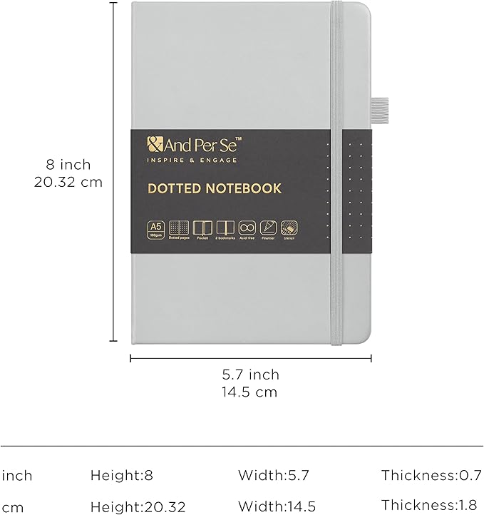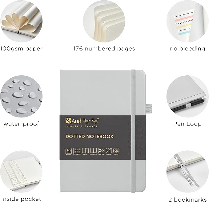 &And Per Se Bullet Dotted Journal Notebook, A5 Leather Hardcover, 176 Numbered Pages 100GSM Thick Dotted Paper, 2 Sheets of Stencils Included - 5.7'' x 8'' (Grey)