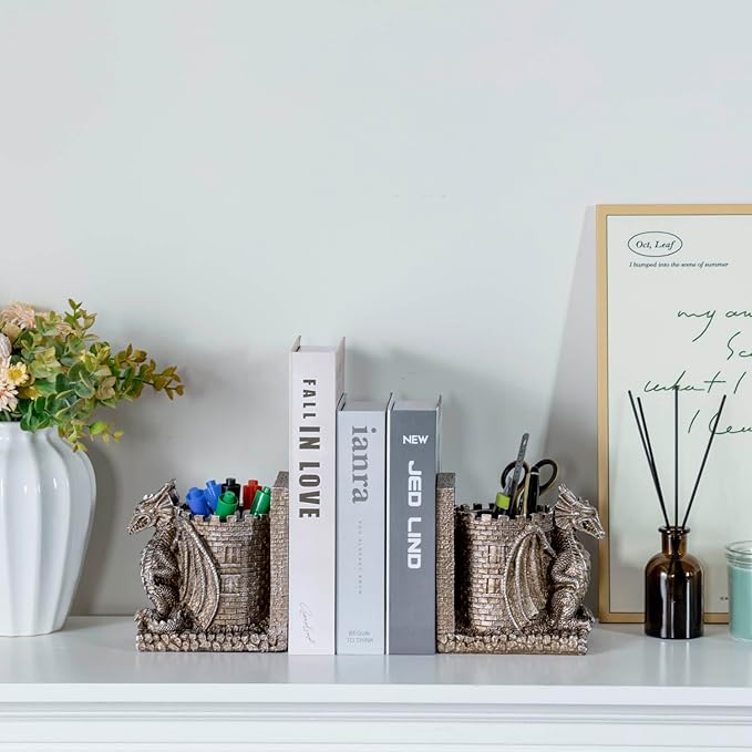 - A Unique Fantasy-Themed Gift: Whether a fan of medieval realms, gothic decor, or an enthusiast of magical and dark, mystical beasts, these book ends with pen holders are the ultimate present for readers of tales from the Middle Ages, safeguarding a collection of fantasy, magic, or adventure literature **Includes full bottom pad**