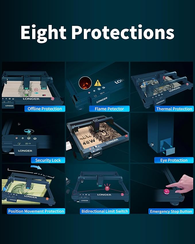 - Eight Safety ProtectionοΌSafety Lock: Restrict children from using the engraver; Laser Module Panoramic Filter Glass: Block blue light and filter 97% UV to protect eyes; Position Movement Protection: Stop the machine if it moves or tilts during operation; Flame Detector: Prevent wood burning for worry-free engraving; two Way Limit Switch: Alarm-triggered auto zero for laser head protection; Emergency Stop Button: Stop the machine for safety in accidents; Offline Protection; Thermal Protection