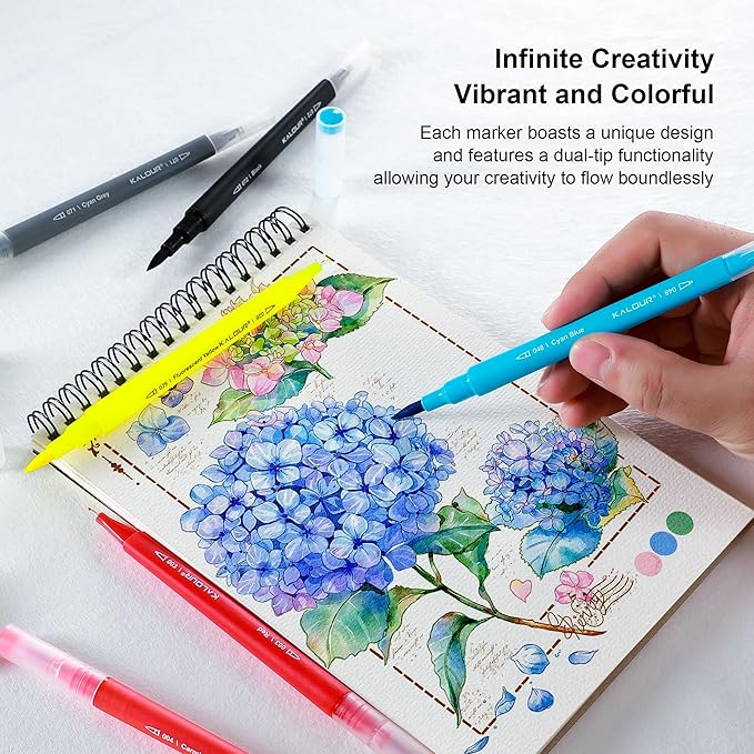 - Dual-Tip Versatility: Each marker is equipped with a flexible brush tip for broad strokes and blending, and a fine point tip for detailed lines and precision. Ideal for a range of applications including sketching, hand lettering, art projects, and design work.
