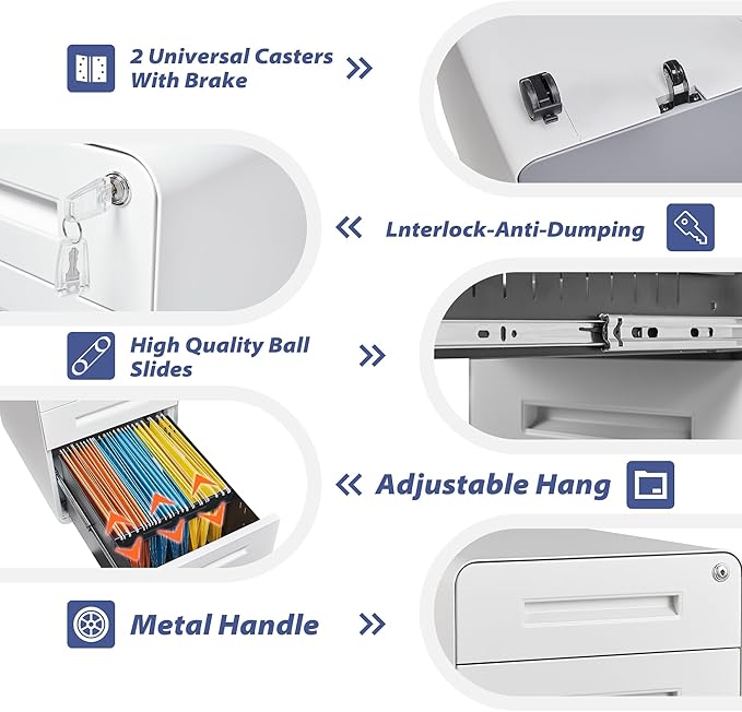 - 【Ample Storage Space - Meet Your Needs】: The white locking file cabinet with adjustable hanging rods can accommodate letter, A4, and F4 size hanging file folders, perfect for organizing your files, documents, and other office supplies. Overall dimensions are 17"D x 31.5" W x 27.5" H. Drawer dimensions are 15.7" D x 15" W x 12", providing ample storage space. Additionally, the mobile filing cabinets are designed with sturdy ball-bearing slides, allowing you to effortlessly Open and close drawers.