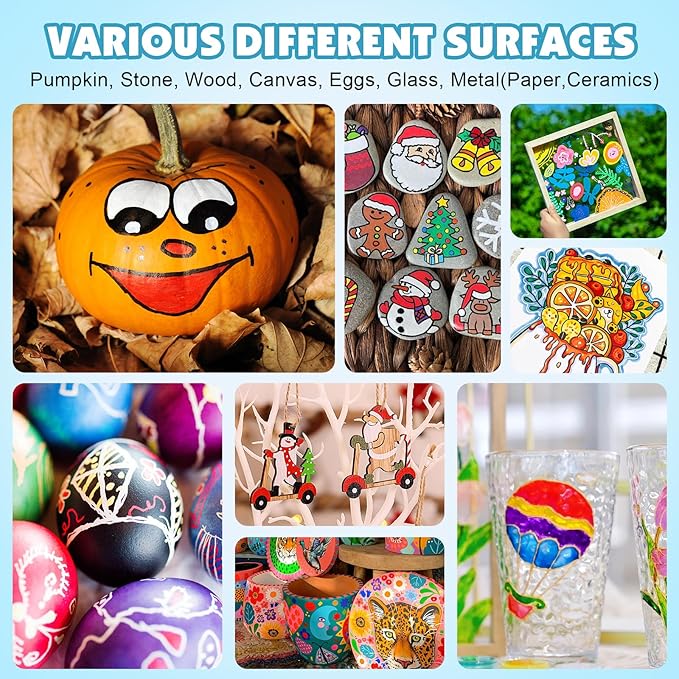 - 【Convenient to Use】Our paint pens with new design.You don't need to shake or press when using it,open the pen cap and you can start your creative journey.our acrylic pens are cotton nibs that it can be used directly.Our acrylic markers conforms to ASTM D-4236.Warm tip:To ensure the smoothness of the ink, please place the pen flat and cover it with a pen cap after use.