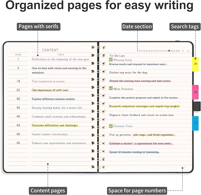 - ORGANIZED AND PRACTICAL NOTEBOOK: Our lined spiral notebook features 140 numbered pages and 4-page blank table of contents. In a medium A5 size 5.7" Γ 8.3", providing ample writing space while remaining lightweight and easy to carry