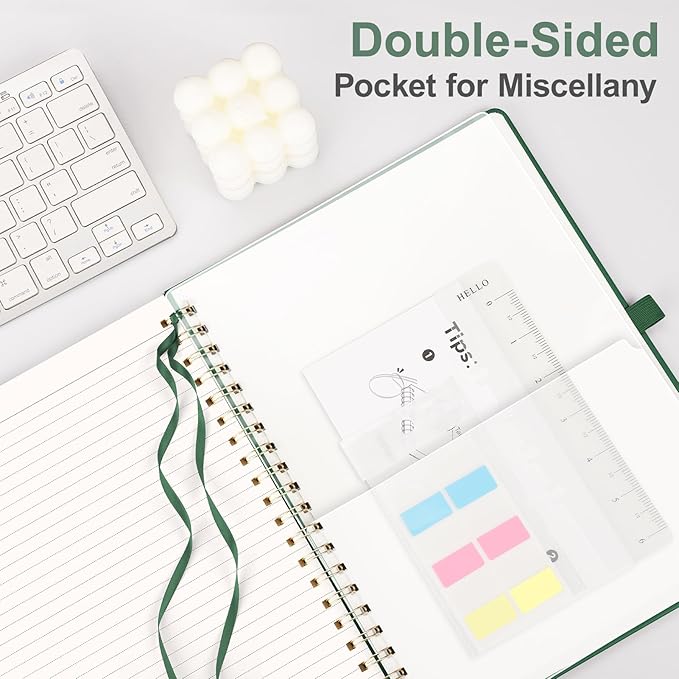 - PRACTICAL LAYOUT: Equipped an elastic band, a pen holder and removable bookmark ruler to keep your notebook organized. Comes with a DIY bookmark with a ribbon for self-attachment to the spiral, serving as a bookmark. Features a double-sided pocket for storing miscellany and 18pcs sticky notes for additional organization and reminders