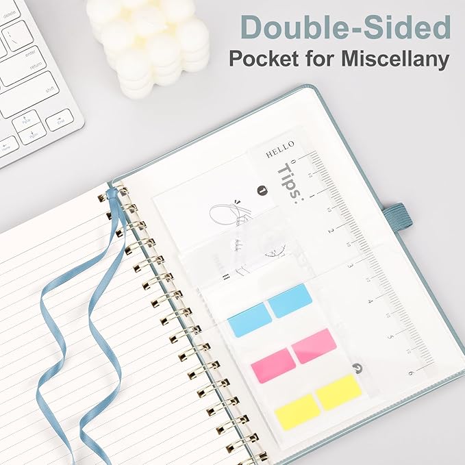 - PRACTICAL LAYOUT: Equipped an elastic band, a pen holder and removable bookmark ruler to keep your notebook organized. Comes with a DIY bookmark with a ribbon for self-attachment to the spiral, serving as a bookmark. Features a double-sided pocket for storing miscellany and 18pcs sticky notes for additional organization and reminders