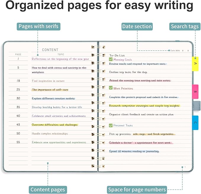 - ORGANIZED AND PRACTICAL NOTEBOOK: Our lined spiral notebook features 140 numbered pages and 4-page blank table of contents. In a medium A5 size 5.7" Γ 8.3", providing ample writing space while remaining lightweight and easy to carry