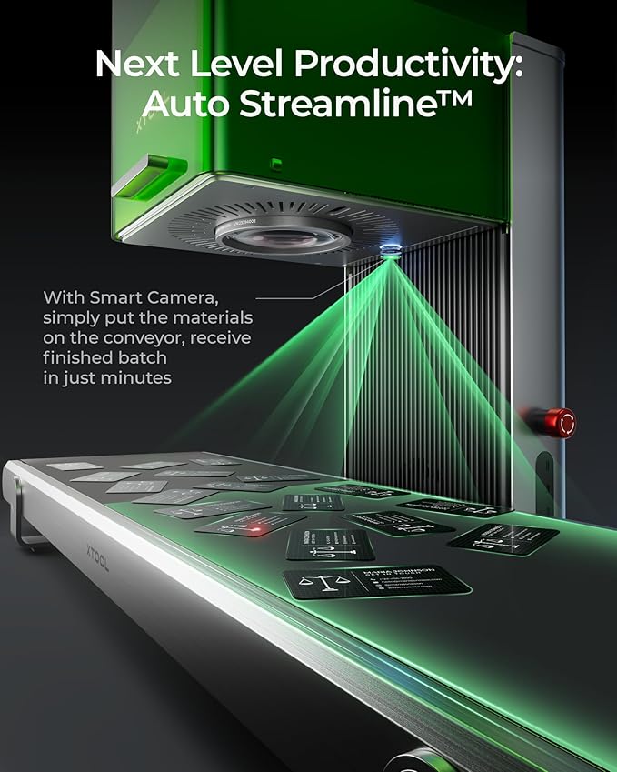 - Factory-Level Productivity: xTool's exclusive Auto Streamline Production, powered by the Auto Conveyor (available separately) and a 16MP SMART CAMERA system, effortlessly manages batch engraving. This laser engraver and cutter machine automatically recognizes shapes on the conveyor, intelligently fills patterns on every piece nonstop, and with its 10,000mm/s speed, completes entire batches in minutes.