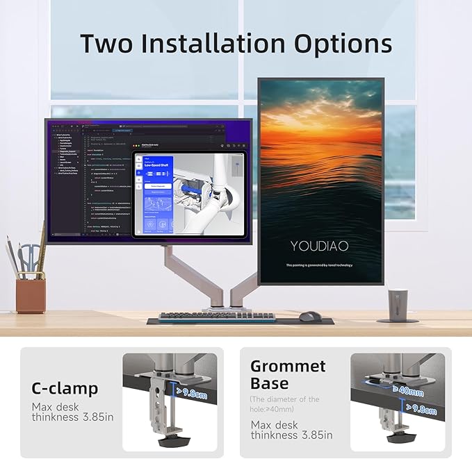 - Two install options - C-clamp and optional grommet base save your valuable desk space(fits desk up to 3.85" thickness).