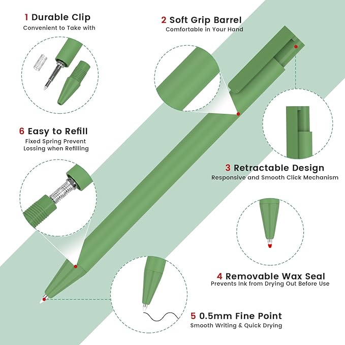 - ✍️ Convenient Retractable Pens: GELETER pens have sturdy clips to clip onto bags or notebooks, keeping them handy and preventing misplacement. They feature a retractable tip to avoid ink smudges. One click extends the tip for use, and it retracts after, simple and stress-free.