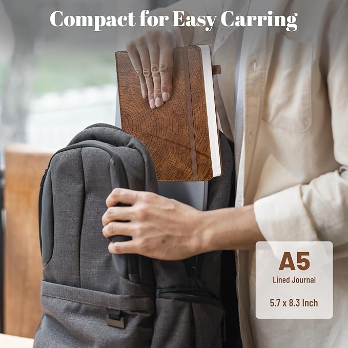 - ๐๐๐ ๐๐ง ๐๐๐๐ญ๐ก๐๐ซ ๐๐จ๐ฎ๐ง๐ ๐๐จ๐ฎ๐ซ๐ง๐๐ฅ:The cover features a tree growth ring pattern, lightly debossed onto cruelty-free vegan leather. The textured cover adds visual interest and sets it apart from plain designs. The tree ring pattern represents personal growth, accomplishments, and the challenges along the way. 5.7 ร 8.3 inches, compact and easy to carry