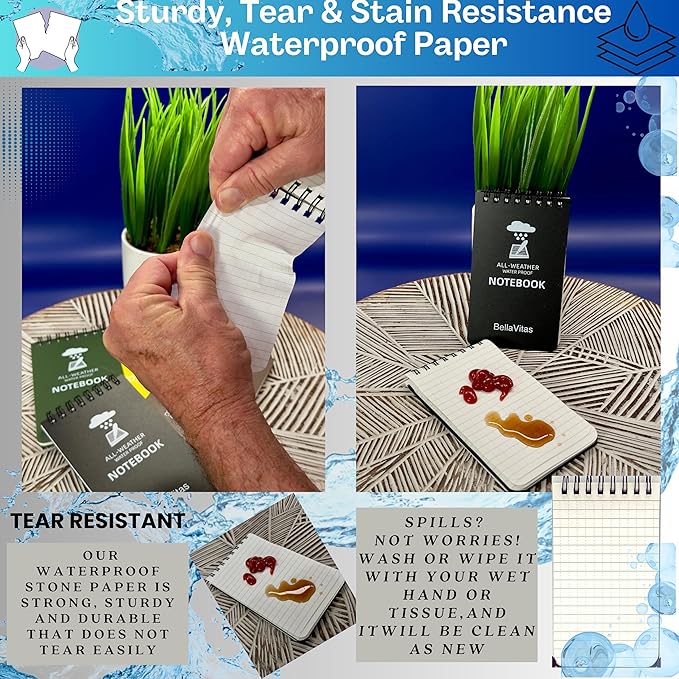 - RELIABLE WATERPROOF DESIGN: This Bellavitas waterproof notebook ensures your notes remain intact even in wet conditions, making it perfect for outdoor use and all-weather note-taking scenarios.