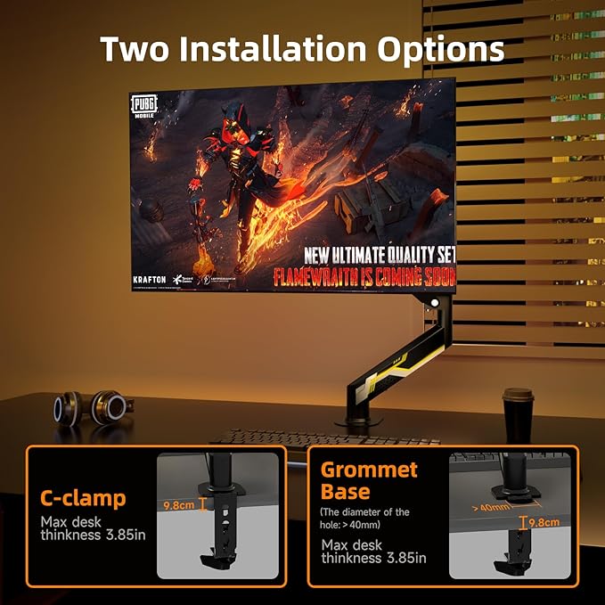 • Two install options - C-clamp and optional grommet base (fits desk up to 3.85" thickness) save your valuable desk space.