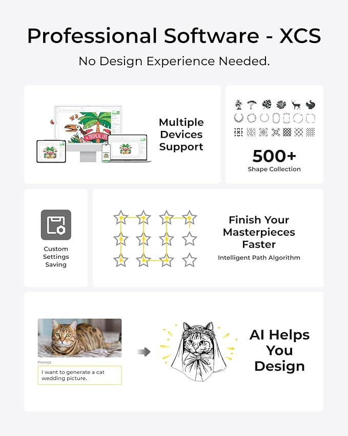 - Safety First: xTool P2S ensures safety with AI fire detection, automatic lock, and emergency stop. Its enclosed design, adjustable air assist, and 233.3 CFM exhaust fan provide efficient smoke removal for cleaner, safer operations in this advanced laser engraver and cutter machine.