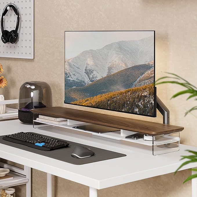 Fenge Acrylic Monitor Stand Riser, 42.5 Inches Dual Monitor Stand with Metal Storage, 2 Tier Acrylic Computer Riser for Desk, Clear Laptop Stand for PC, Laptop, Printer, TV, Brown
