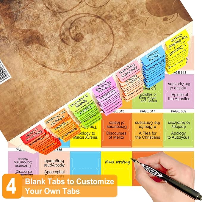 • Comprehensive Indexing: These color-coded laminated tabs provide a complete indexing system for the 100-Book Apocrypha, 2024 Edition, with 72 tabs covering 68 book chapters, 4 blank tabs, and 1 tab placement guide card