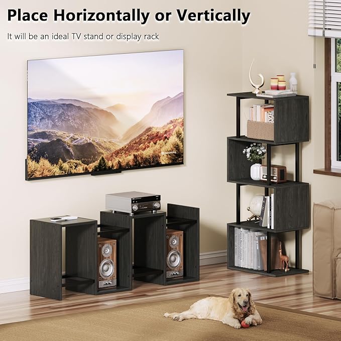 - [More Uses S-Shaped Book Shelf]: Modern staggered rectangular design, which increases the load-bearing and more aesthetic. Besides being used as a bookshelf, placed vertically as room divider, also be placed horizontally, it will be an ideal wine rack or TV stand