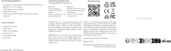 - IRIScan micro embedded AI noise reduction technology Built-in G-sensor, automatically rotates the video Dual-mode autofocus (AF-C / AF-S) Foldable, compact design to easily move or store Plug-and-play, UVC/UAC compliant with USB TYPE-C Come with an interactive Readiris Visual software compatible with Windows & macOS