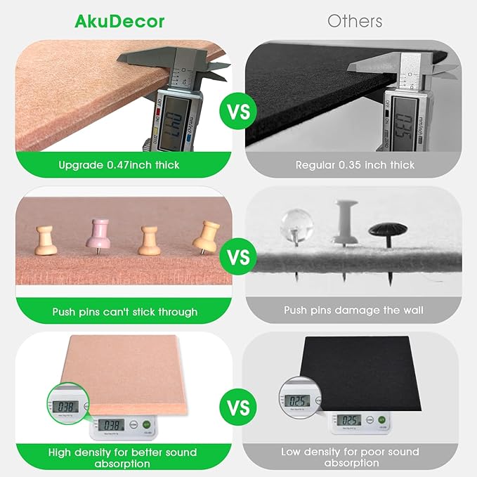 - 【Thickened Cork Boards】Our cork board alternatives have higher thickness (25% thicker) and density (35% denser) than traditional cork boards, which means better durability and sound absorption. It prevents push pins from sticking through the felt board and damaging the wall.