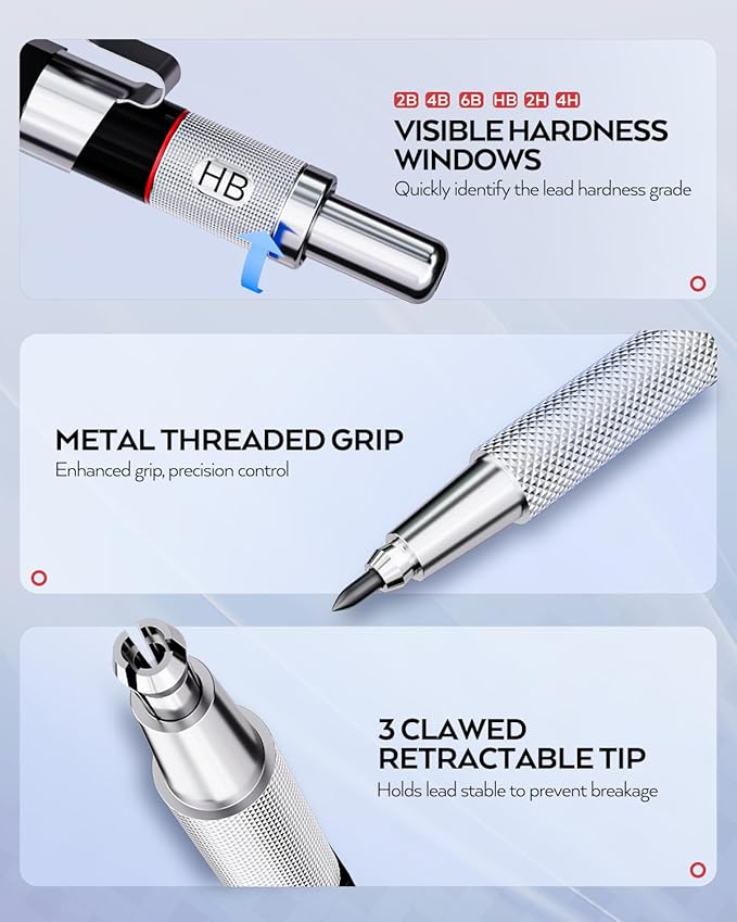 - Fancy Design:The full metal HB lead pencils come with a polygonal barrel,which is comfortable to hold and non-slip on your hand,equipped with eraser refills, ensuring accurate erasure of handwriting, 4 mm tip length makes it ideal for use with rulers and templates.various line size (0.3mm, 0.5 mm,0.7 mm & 0.9 mm) satisfy your daily demand.