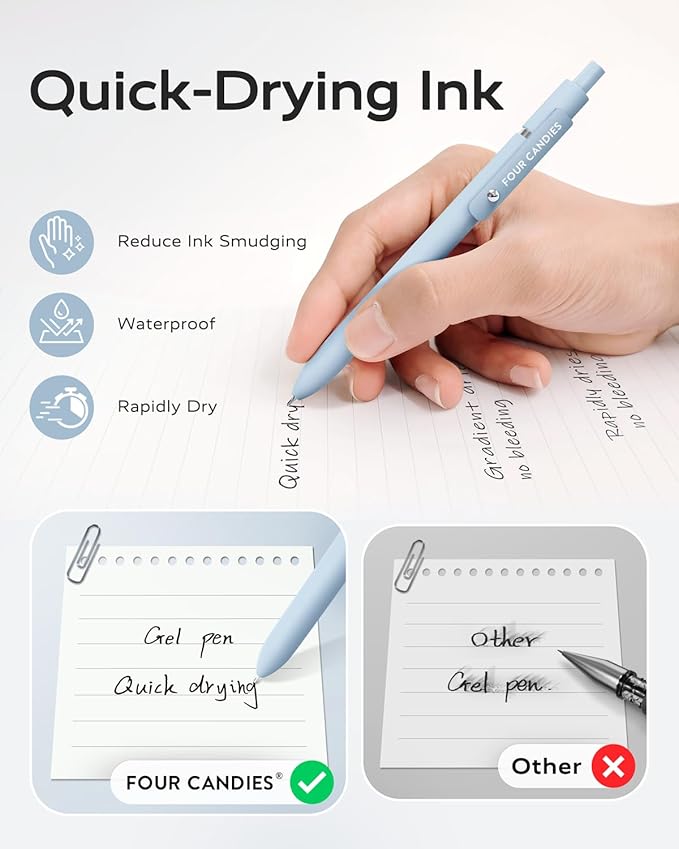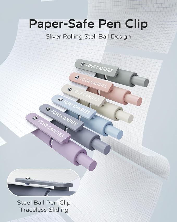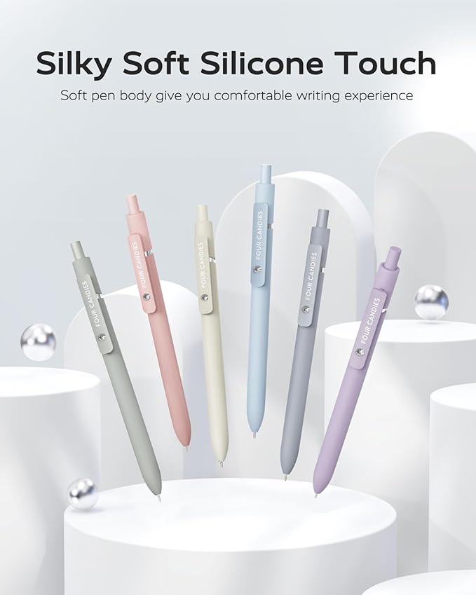 - [ Soft Grip & Multi-function Clip: ] You will receive 6pcs quick-drying ink pens with a modern minimalist design to suit your needs Daily use and replacement needs. You can clip the ballpoint pens to the book,bag,binder,or pocket easily, which is convenient to carry and prevents loss.Super soft silicone features grip bring a super soft touch feeling which makes each Four Candies gel pen easy and comfortable to hold.