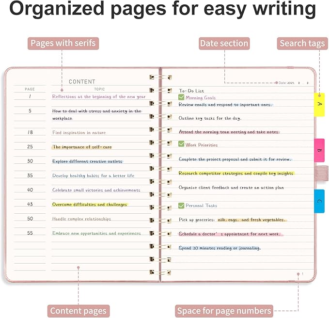 - ORGANIZED AND PRACTICAL NOTEBOOK: Our lined spiral notebook features 140 numbered pages and 4-page blank table of contents. In a medium A5 size 5.7" Γ 8.3", providing ample writing space while remaining lightweight and easy to carry