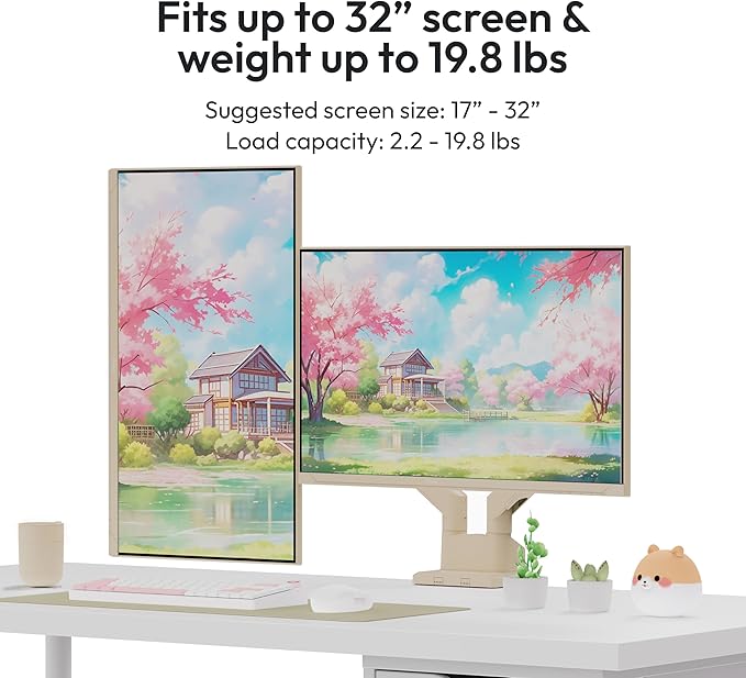 - Dual Monitor Setup - Accommodates two monitors up to 32 inches each and supports up to 19.8 lbs per arm. Each arm has a plate that can support 75x75mm and 100x100mm VESA mounting patterns.