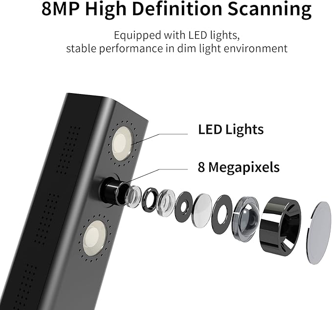 - Excellent Performance: Includes a 8MP camera (resolution: 3264*2448) and LED lights with adjustable brightness. Shine800 has a variety of useful features such as OCR, automatic tilt correction, front and back combination, etc. Notice: glossy materialsοΌglossy photo,glossy magzineοΌare NOT recommended